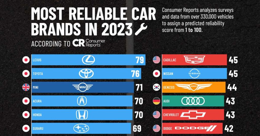 تویوتا و لکسوس، دو غول خودروسازی ژاپن، به ترتیب مقام اول و دوم را به خود اختصاص دادهاند. این یعنی خودروهای این دو برند به طور متوسط مشکلات فنی کمتری دارند و عمر طولانیتری دارند.