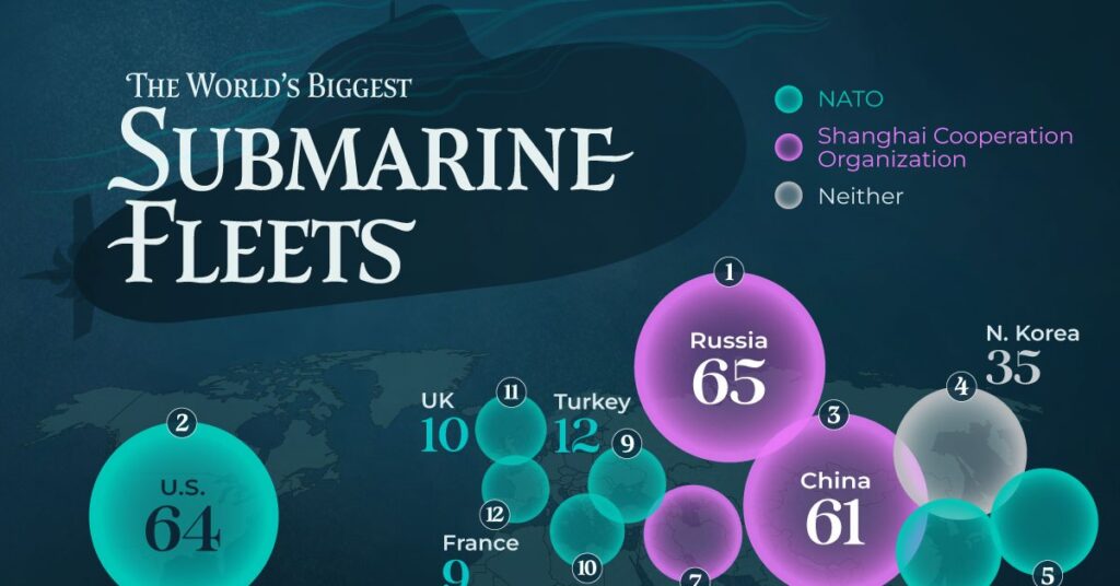 طبق جدیدترین آمار، روسیه با دارا بودن 65 زیردریایی، بزرگترین ناوگان زیردریایی جهان را در اختیار دارد. ایالات متحده با 64 و چین با 61 زیردریایی در ردههای بعدی قرار میگیرند. این سه کشور به تنهایی حدود 40 درصد از کل زیردریاییهای جهان را در اختیار دارند.